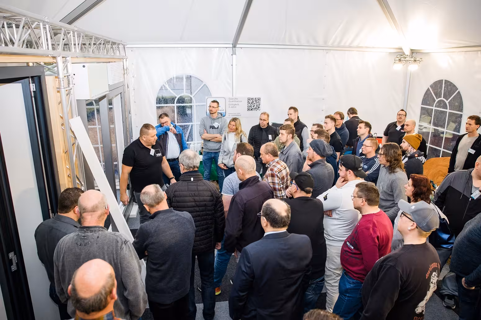 Aufgrund des hohen Zuspruchs wurden die Gäste nach der Begrüßung in zwei Gruppen geteilt. Im Wechsel durften sie allerlei Wissenswertes rund um die Hebe-Schiebe-Tür in einem interessanten Fachvortrag erfahren sowie die praktische Umsetzung bei einer Live-Montage erleben.