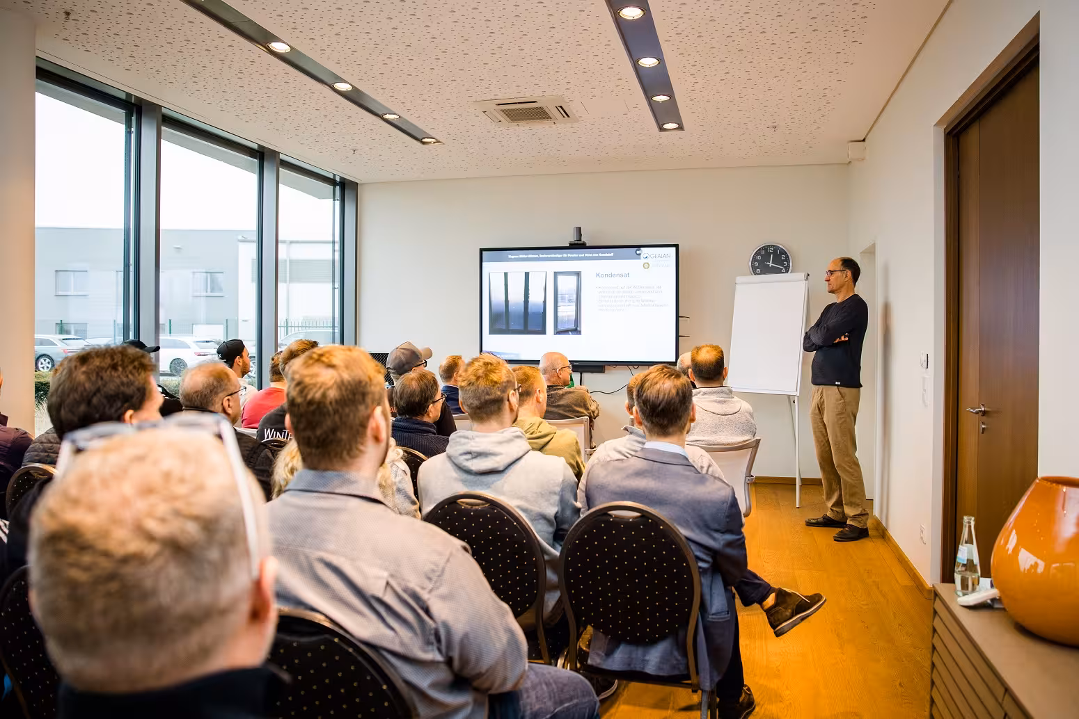 Im Theorieteil wurde eine gemeinsame Basis an Vorwissen gelegt: Ein Fachvortrag zu den „Bauphysikalische Grundlagen“ schaffte den Einstieg ins Thema Hebe-Schiebe-Tür. Mit der Auflistung allgemeiner Anforderungen, Tipps zu Angeboten, möglichen Vorbereitungen für Aufmaßtechniker und dem Hinweis auf typische Montagefehler ging es schließlich tiefer in die Materie.