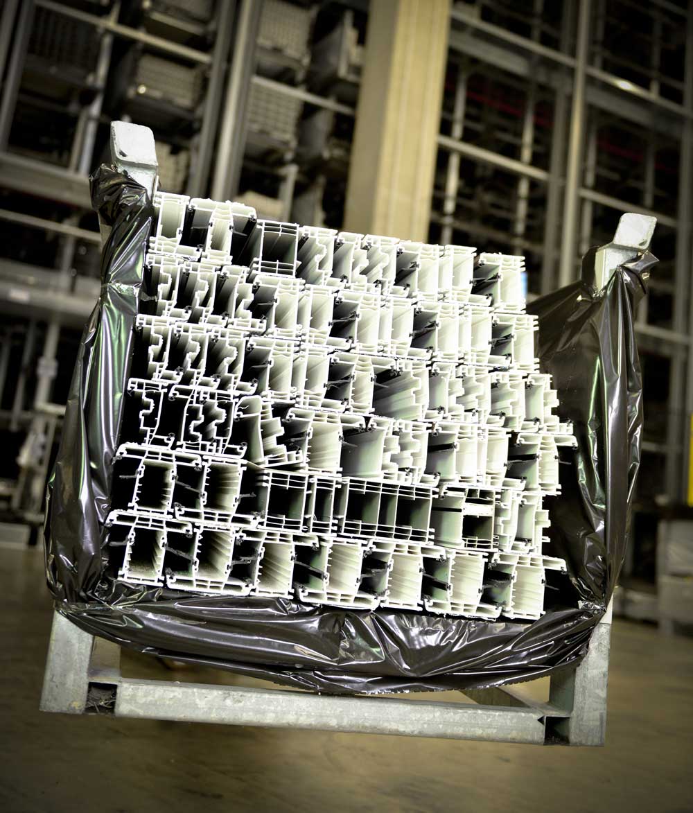 Gepackt wie bestellt, Order Change macht’s möglich: Die Produktionsplanung des Kunden gibt die Reihenfolge vor, in der GEALAN Profilstangen in Container legt. Profile, die der Kunde zuerst verarbeiten möchte, liegen oben.