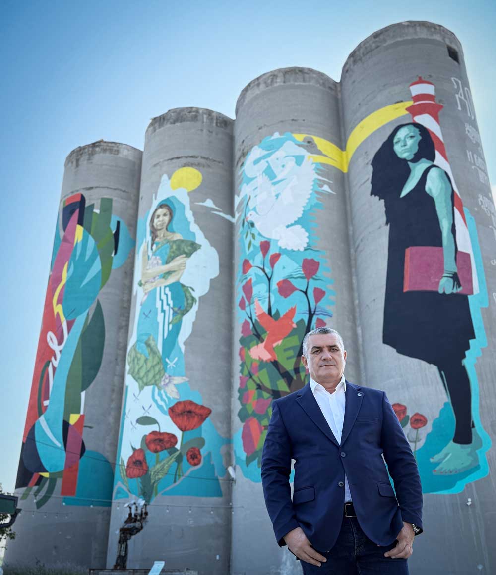 Von der verwaisten Brache zu Belgrads größter Leinwand: Grujo Ristić vor den 28 Meter hohen Silos des Kulturzentrums Silosi am Donauufer. Hinter und unter den riesigen Wandmalereien, in und um die Silos finden Ausstellungen, Konzerte, Festivals, Messen, Partys, Sport- und Umwelt-Events statt. Silosi definiert sich als Symbol des modernen Belgrads.