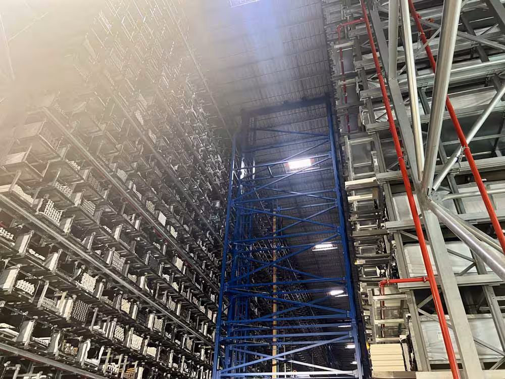A high-bay warehouse describes a warehouse with shelves from a height of 12 meters. Normally, it offers several thousand pallet storage spaces, where both flat goods and long goods can be stored. The new high-bay warehouse at GEALAN's Tanna site is a so-called automatic long goods warehouse.