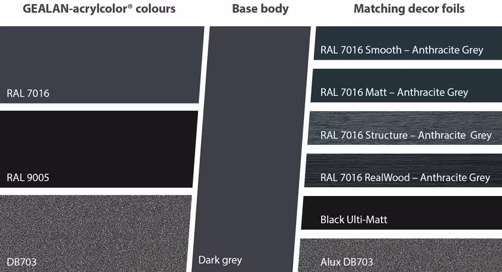 Samo najbolje za novu vrhunsku kombinaciju: u budućnosti će se dokazana površina GEALAN-acrylcolor® spojiti s tamnim osnovnim tijelom u svojim vrhunskim bojama RAL 7016, RAL 9005 i DB 703. Dok visokokvalitetni PMMA oplemenjuje tamne GEALAN profile izvana, šest odgovarajućih dekor folija bit će dostupno za unutrašnjost u budućnosti, od antracit sive do crne i DB 703. To stvara širok raspon mogućnosti kombiniranja s kojima tamno estetika se može oblikovati individualno i skladno može biti.