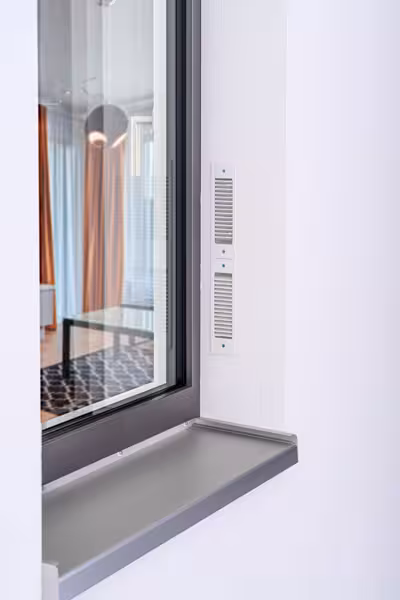 GEALAN acrylcolor, itt DB 703 fémes színárnyalatban, integrált GEALAN-CAIRE® smart szellőztető rendszerrel.