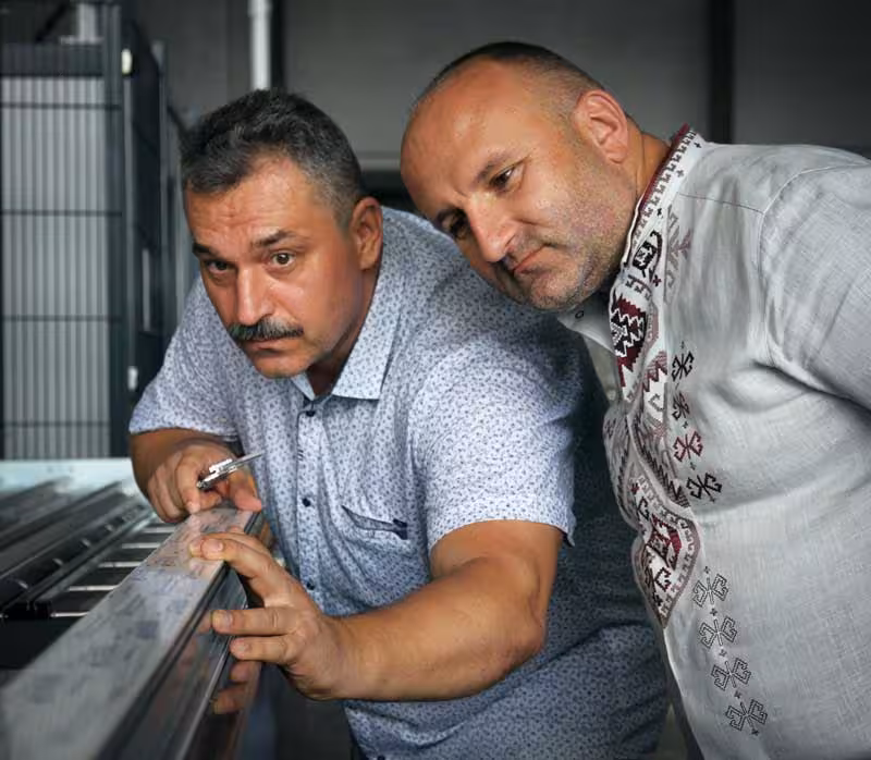 A Viknar'Off vezérigazgatója, Sergii Zakharchyshyn (jobbra) és a GEALAN alkalmazástechnikai mérnöke, Yurii Chervonyi egy új profilfeldolgozó rendszeren dolgoznak; a gyártósor egy műszak alatt akár 300 ablak előállítására képes és alkalmas GEALAN-acrylcolor® profilok feldolgozására is.